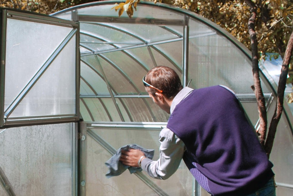 Нам нужно подготовить теплицу для зимовки. В остальное время теплица не требует значимого ухода. И так начинаем готовиться к зиме. Просто закрыть все двери и форточки и уехать не получиться. Первым делом нужно навести порядок, убрать остатки растений из теплицы, а также ее стенок. Чтобы поликарбонат радовал вас своим внешним видом долгие годы, и не ухудшалась урожайность парника, нужно вымыть поликарбонат водой с мылом. Только мыть нужно мягкой губкой или тряпкой. Главное не использовать скребки и сыпучие чистящие средства. Так поликарбонат не потеряет свою прозрачность.